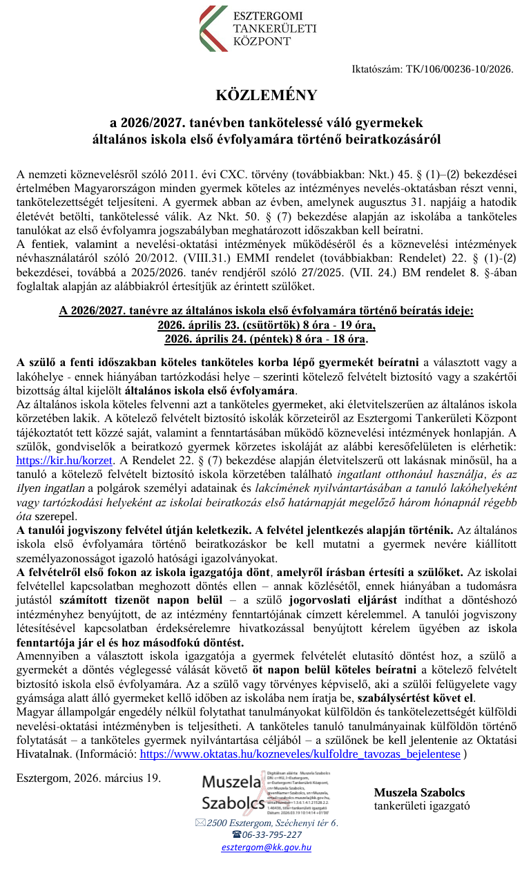 Jelen tájékoztató közzétételre került az intézmény honlapján.